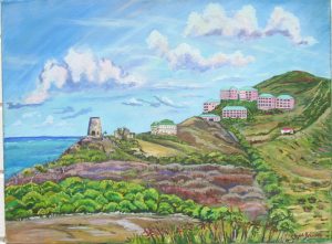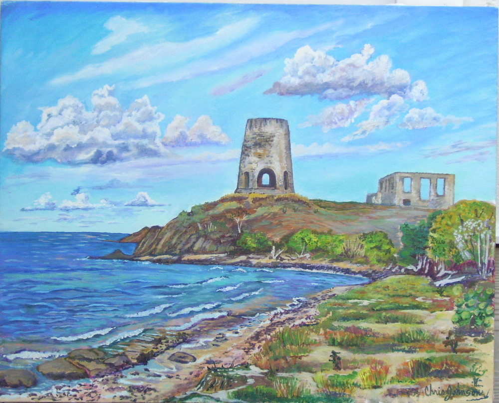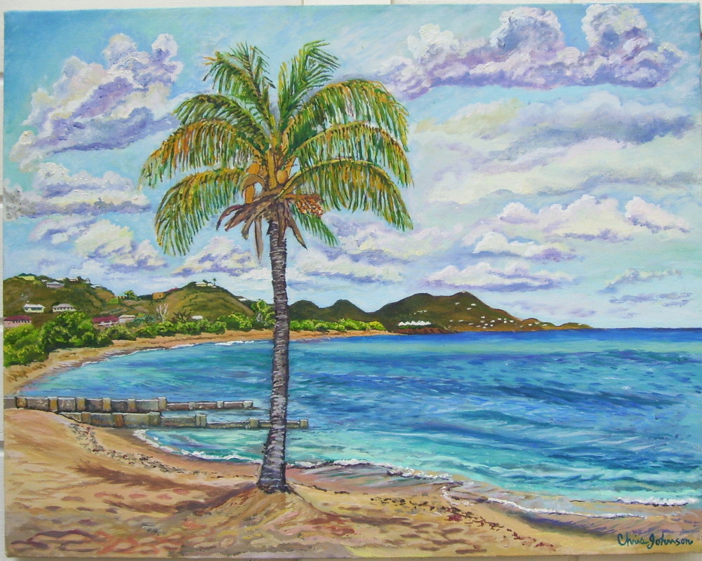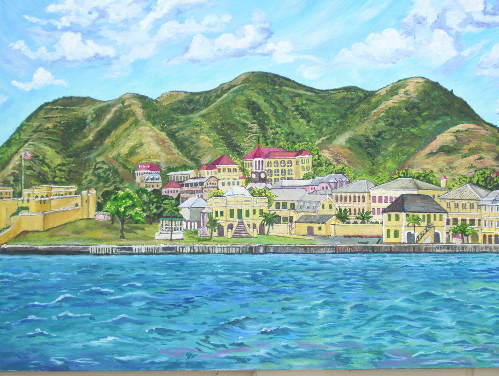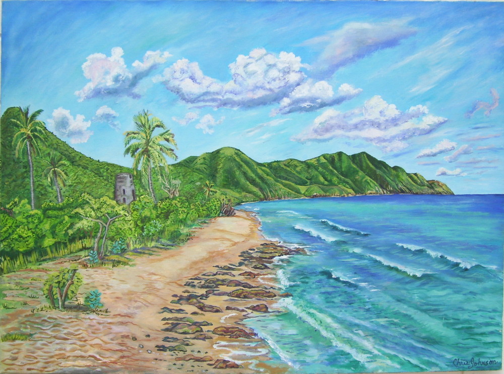 This lends the viewer a chance to experience something beyond a familiar storybook view of the Buccaneer Hotel or Cane Bay; a sense of the artist's own experience is also captured. Gazing on one of these bright, childlike canvasses elicits thoughts of meditative days spent on ai sunny hilltop, dipping a brush into a palette of bright blues and greens, and taking the time to really LOOK.