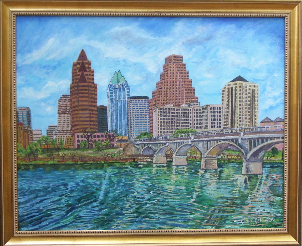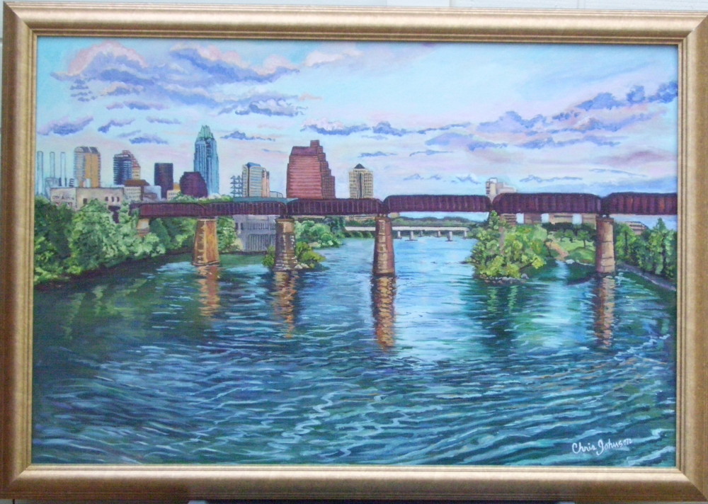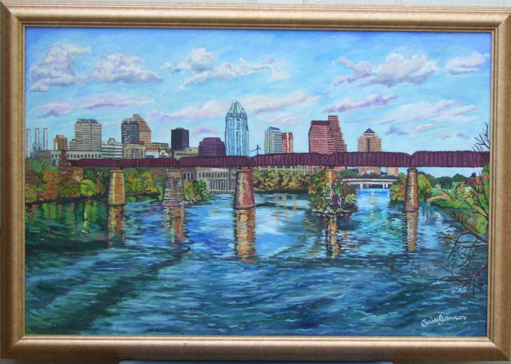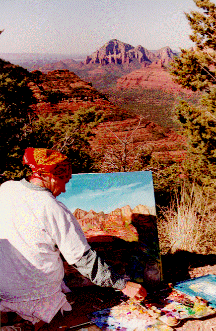 This picture of Chris Johnson on location in Sedona, Arizona was taken by a photography student also enjoying the magnificent view. Her paintings include scenes from the mystical Mayan Ruins of Mexico, the lush green landscape of the Virgin Islands, mountain and desert scenes from Arizona, and cityscapes from Austin, Texas. She also paints still lifes and modern art.