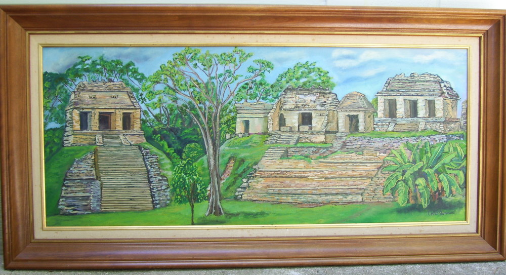 This is a 17″ x 40″ oil painting. The Mayan Ruins at Palenque, Mexico are massive and cover a lot of area. This scene was painted from the group of ruins known as the “North Group”. The structure on the left has an original leopard skin tarp hanging from the ceiling. This group of ruins is particularly mystical, their purpose is unknown.