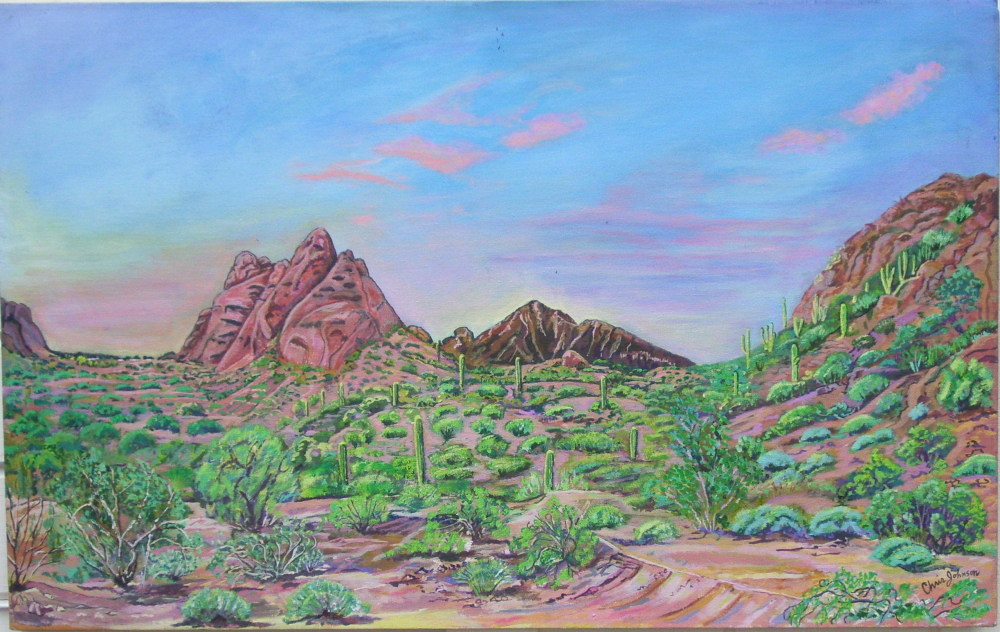 This 24″ x 38″ acrylic painting was painted in 1995. Papago Park is a beautiful park in the heart of Phoenix, Arizona. The botanical garden lies to the right of the scene and the mysterious Red Rocks are evidence of Indian sacred ground. This painting looks like it is in the remote desert, but actually it is right in town. The Sky Harbor Airport is just off the left of the picture and planes land every 10 to 20 seconds. McDowell Rd is just the other side of the grand Red Rock and packed with traffic. Camelback Mountain is in the distance in the center of the painting. Picture of Chris Johnson with her picture of Papago Park on painting location in Sedona, Arizona.