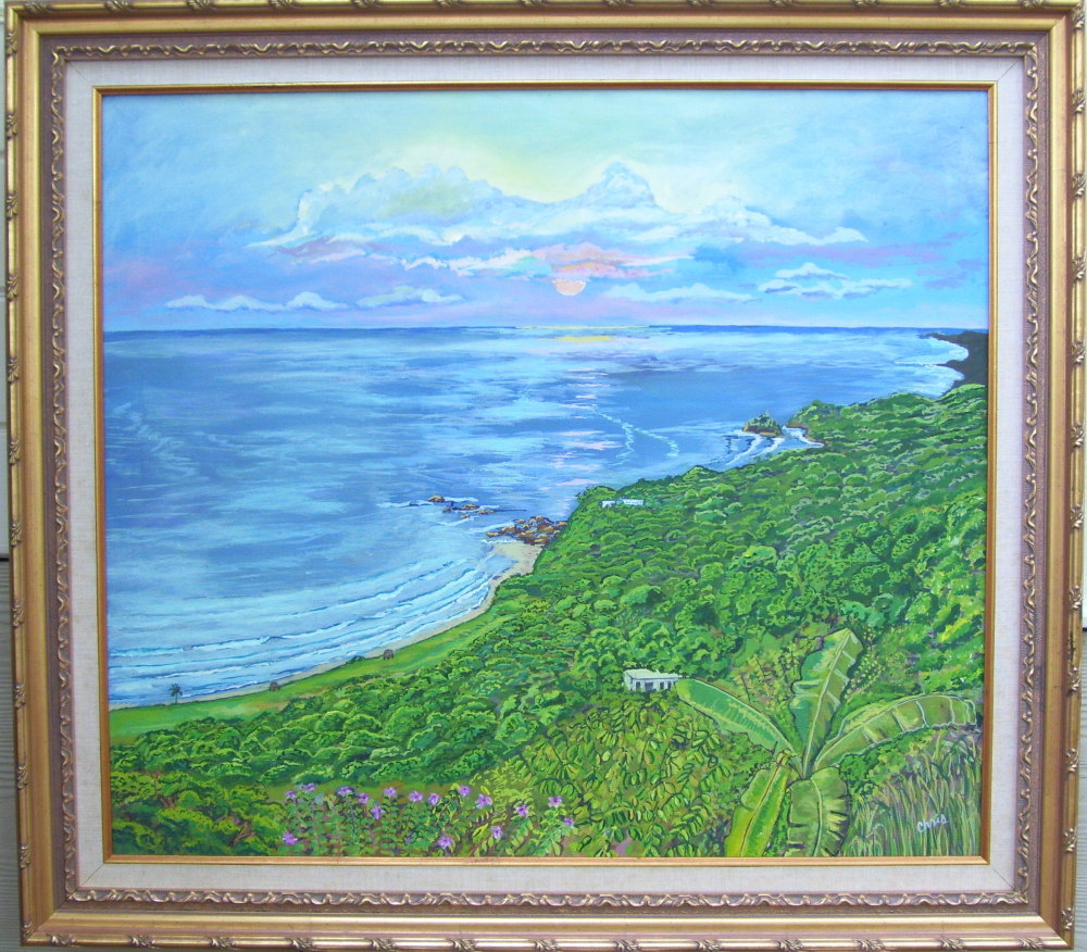 This 28″ x 32″ acrylic painting was painted in 1992 in Playa Nosara, Costa Rica. From high atop the mountain near the beach at Playa Nosara, Costa Rica, this view is looking very far west as the sun sets.