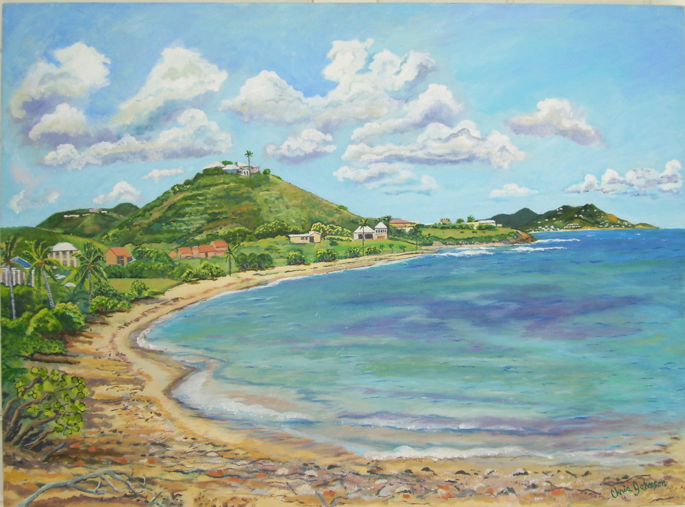 This 28″ x 38″ oil painting was painted in 1999. This elegant beach is a favorite swimming spot of the island. The reef makes the water so calm and inviting. The hills are dotted with beautiful homes of shoys estates.